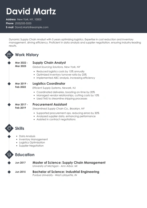 In terms of how to organize and present your data, it’s best to stick to the reverse-chronological format for supply chain analyst resumes. This means that you’ll be listing your most recent experience first to highlight your biggest accomplishments as a supply chain professional.