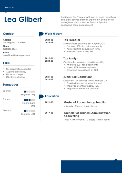 Pro Tip: Numbers don’t lie and you know it best. Add some $ or % to your tax preparer resume to show your achievements are quantifiable.