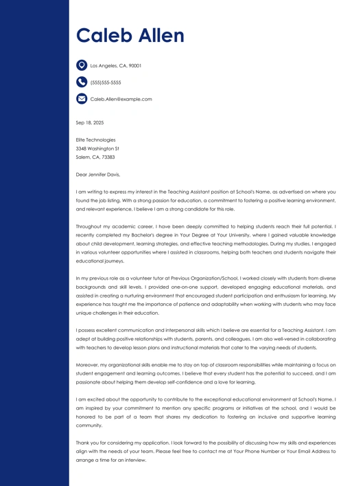 This guide will show you a sample cover letter for assistant teacher jobs, plus tips on how to write a professional teaching assistant cover letter step-by-step.