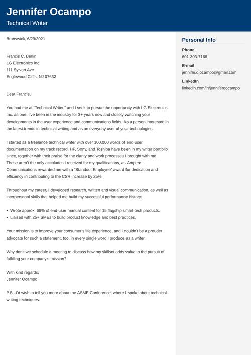 - Personalize: Show your enthusiasm and passion for technical writing. Tell your recruiter why you do the things you do and why it matters to you.
