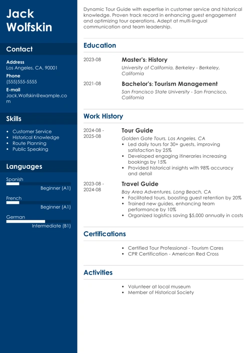 Pro Tip: Not sure how to get everything right on your tour guide resume? See what a resume should look like.