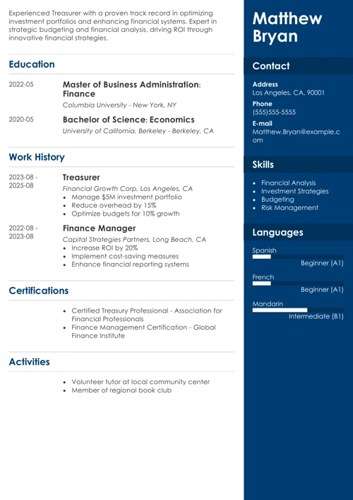 Continue reading to learn how to write a treasurer resume just like the sample above: