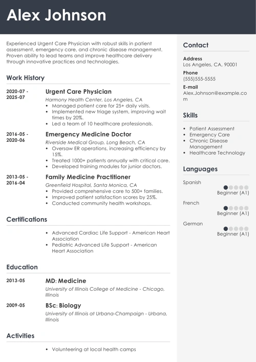 - Tips and examples for showcasing skills and achievements on an urgent care physician resume.