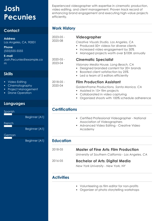 Pro Tip: Not sure how many paragraphs to make a resume for videography jobs? Keep it to a single page unless you’ve got more accomplishments than Spielberg.