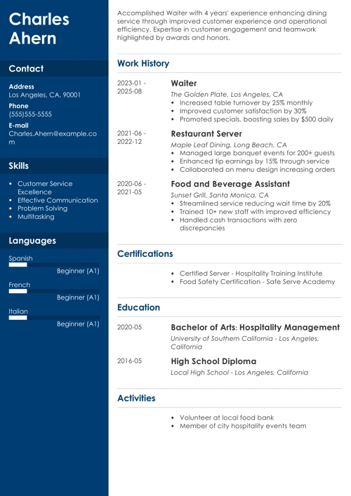 Need more tips for how to start your waiter resume? See this guide: Resume Introduction Examples