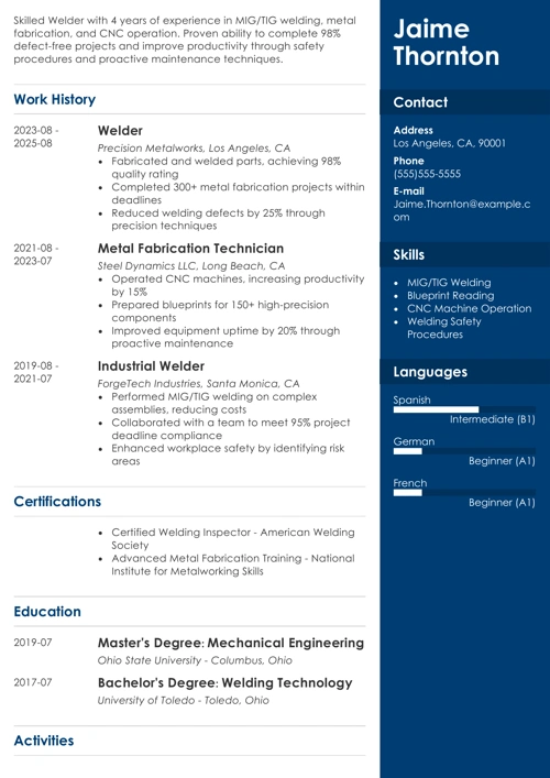 Pro Tip: First time as a welder? If you haven’t had welding experience before, use bullet point entries which document your knowledge of machinery, tools, working with blueprints, etc.